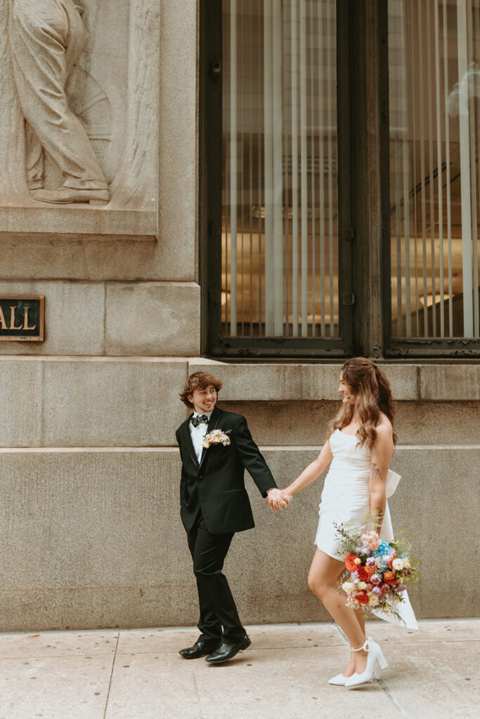Eloping doesn’t mean you have to skip on the fun traditions and romance. A City Hall elopement in Chicago means elegance with a side of urban charm. Whether you’re rocking a sleek suit, a non-traditional dress, or something bold and colorful, you’ll stand out beautifully against the iconic architecture of the city. And once the ceremony part is over, you have the whole city to celebrate in whatever way feels right for you. Whether that’s exploring Michigan ave, a bookstore, the Chicago Cultural Center, getting pizza, or heading over to North Ave beach. I got you!!