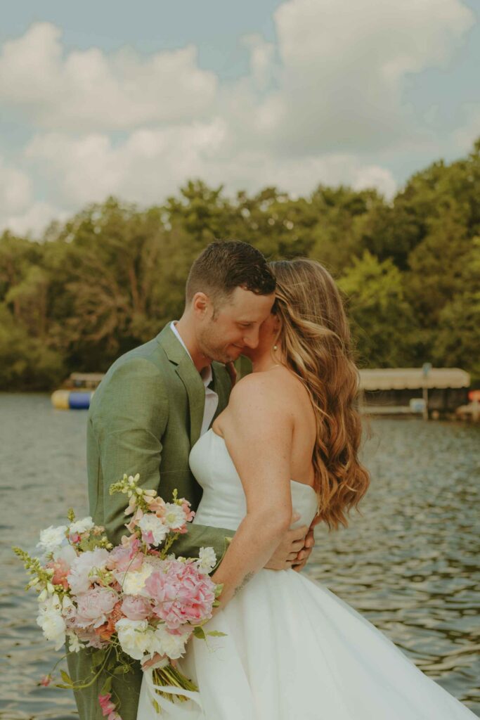 Nora and Peter’s wedding is the perfect example how both digital and film can coexist and enhance each other. They got married in Nora’s family’s backyard overlooking Oconomowoc lake, surrounded by their closest friends and family. The digital shots were perfect for catching every laugh, detail, and in-between moments. The film shots were perfect for a slow, romantic retelling of their wedding. The light hitting Nora’s face just right, the way Peter and Nora looked as they hugged during the first look, the sun shining on the flat lay, the softness of Nora and Peter in the water after sunset.